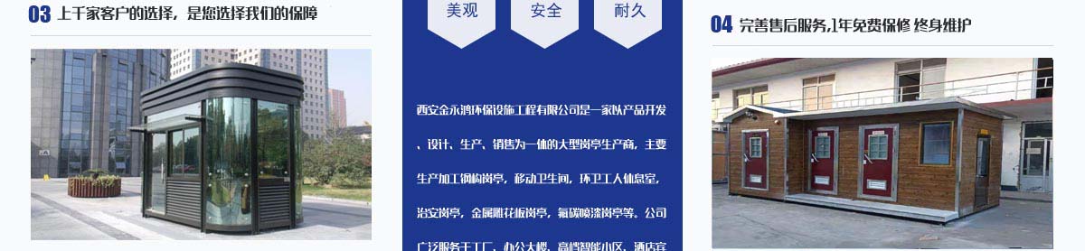 西安金永鴻環保設施工程有限公司是專業的崗亭生產廠家!公司產品主要有:不銹鋼崗亭、收費崗亭、保安崗亭、站臺及鋼結構崗亭、護欄等。我們將以質量優先、價格優先、服務優先的理念回饋廣大新老客戶對金永鴻長期以來的支持和關懷。我們將不斷創新,追求卓越,為您打造最完美的品質、最優質的服務,讓您買得放心、用得舒心。金永鴻與您共創輝煌!